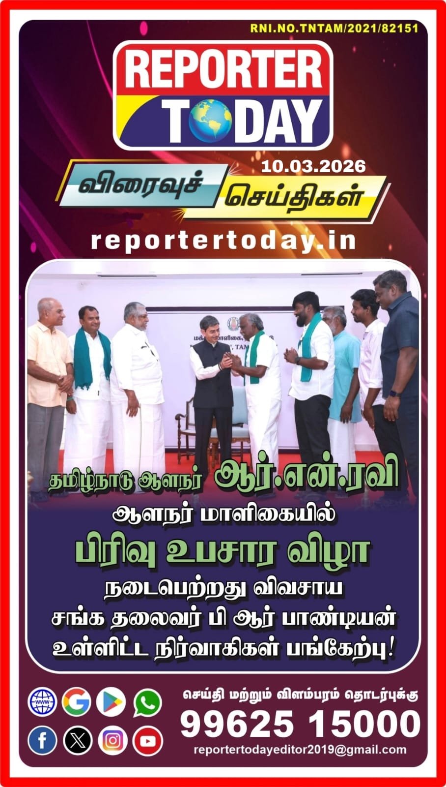 ஆளுநர் ஆர்.என்.ரவி பிரிவுபசார விழாவில் விவசாய சங்க நிர்வாகிகள் பங்கேற்பு! Post navigation பாமணியாற்றில் மன்னார்குடி நகராட்சி கழிவுகள் கலப்பதா?- விவசாயிகள் சங்க தலைவர் பி ஆர் பாண்டியன் கண்டனம்!