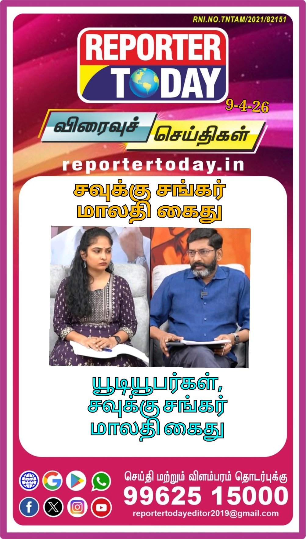 சவுக்கு சங்கர் – மாலதி கைது! Post navigation சவுக்கு சங்கர் மீண்டும் கைது! திருப்பரங்குன்றம் மலையை மே மாதத்திற்குள் அளவீடு செய்ய நீதிமன்றம் உத்தரவு!