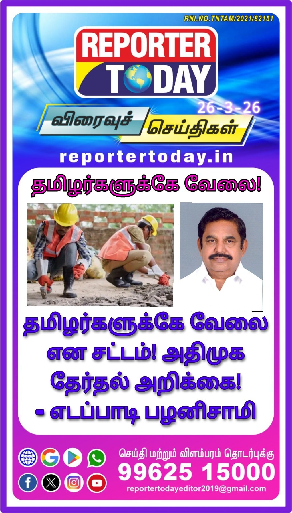 தமிழர்களுக்கே வேலை என சட்டம்! அதிமுக தேர்தல் அறிக்கை! – எடப்பாடி பழனிசாமி Post navigation ‘”சட்டமன்ற தேர்தலை புறக்கணிக்க போவதில்லை!” – பரந்தூர் விமான நிலைய எதிர்ப்பு குழுவினர் அறிவிப்பு