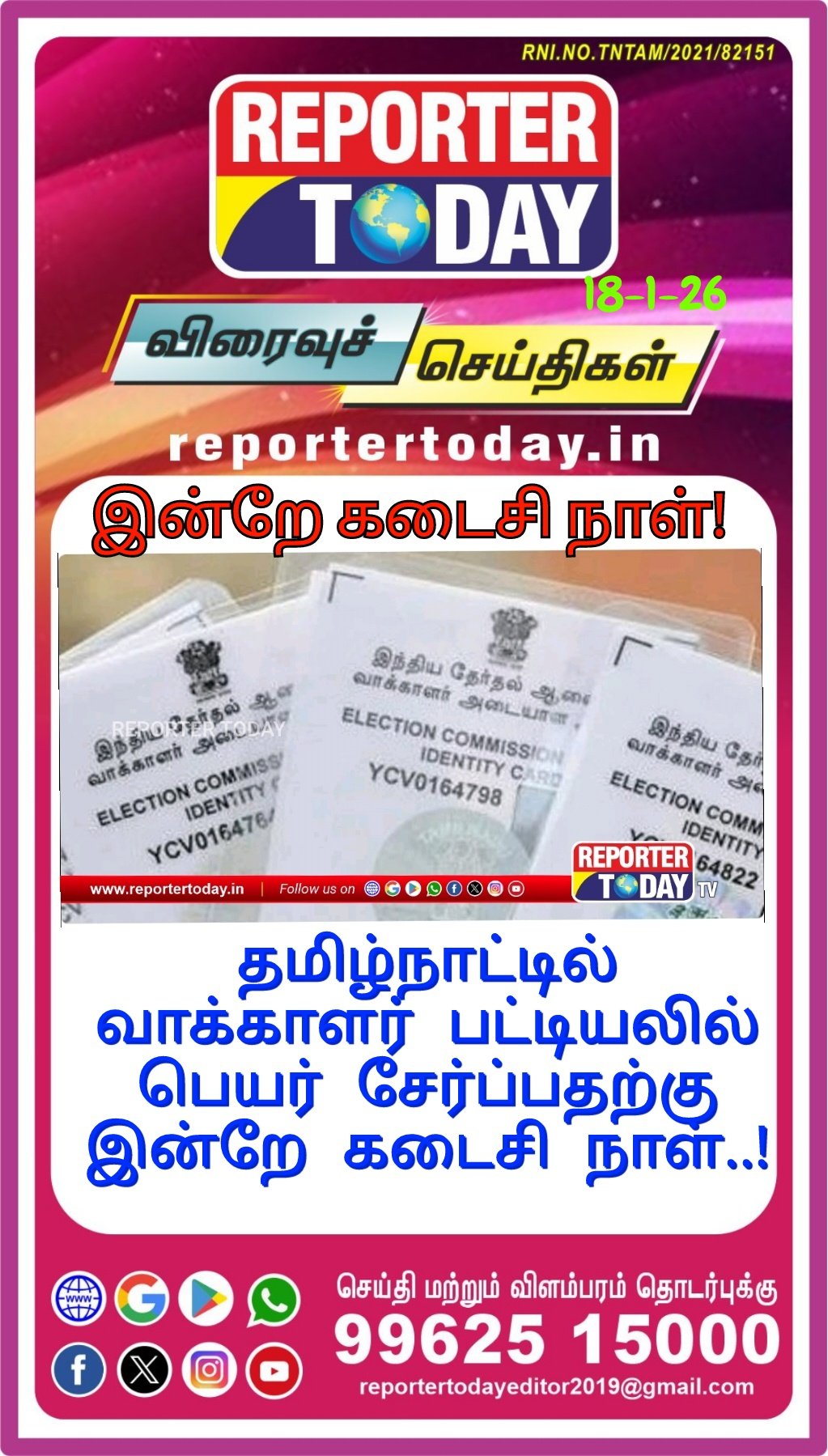 தமிழ்நாட்டில் வாக்காளர் பட்டியலில் பெயர் சேர்ப்பதற்கு இன்றே கடைசி நாள்..! Post navigation இன்று தை அமாவாசை… முன்னோர்களுக்கு திதி கொடுக்க குவிந்த மக்கள் சென்னை தி நகர் உள்ள ரூபி ராயல் நகை அடகு கடை மோசடியை கண்டித்து எழும்பூர் ராஜரத்தினம் மைதானம் முன்பாக ஏராளமான இஸ்லாமியர்கள் கவன ஈர்ப்பு ஆர்ப்பாட்டம்!