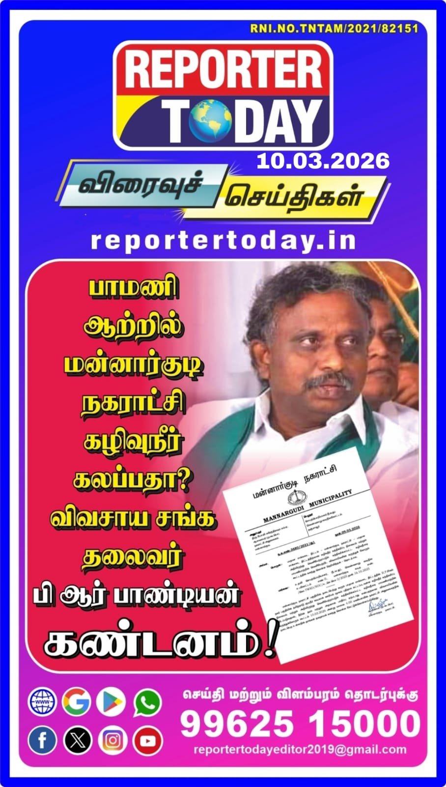 பாமணியாற்றில் மன்னார்குடி நகராட்சி கழிவுகள் கலப்பதா?- விவசாயிகள் சங்க தலைவர் பி ஆர் பாண்டியன் கண்டனம்! Post navigation ஆளுநர் மாளிகையில் ஆளுநர் ஆர்.என்.ரவி பிரிவு உபசார விழாவில் விவசாய சங்க தலைவர் பி.ஆர்.பாண்டியன் பங்கேற்பு! ஆளுநர் ஆர்.என்.ரவி பிரிவுபசார விழாவில் விவசாய சங்க நிர்வாகிகள் பங்கேற்பு!