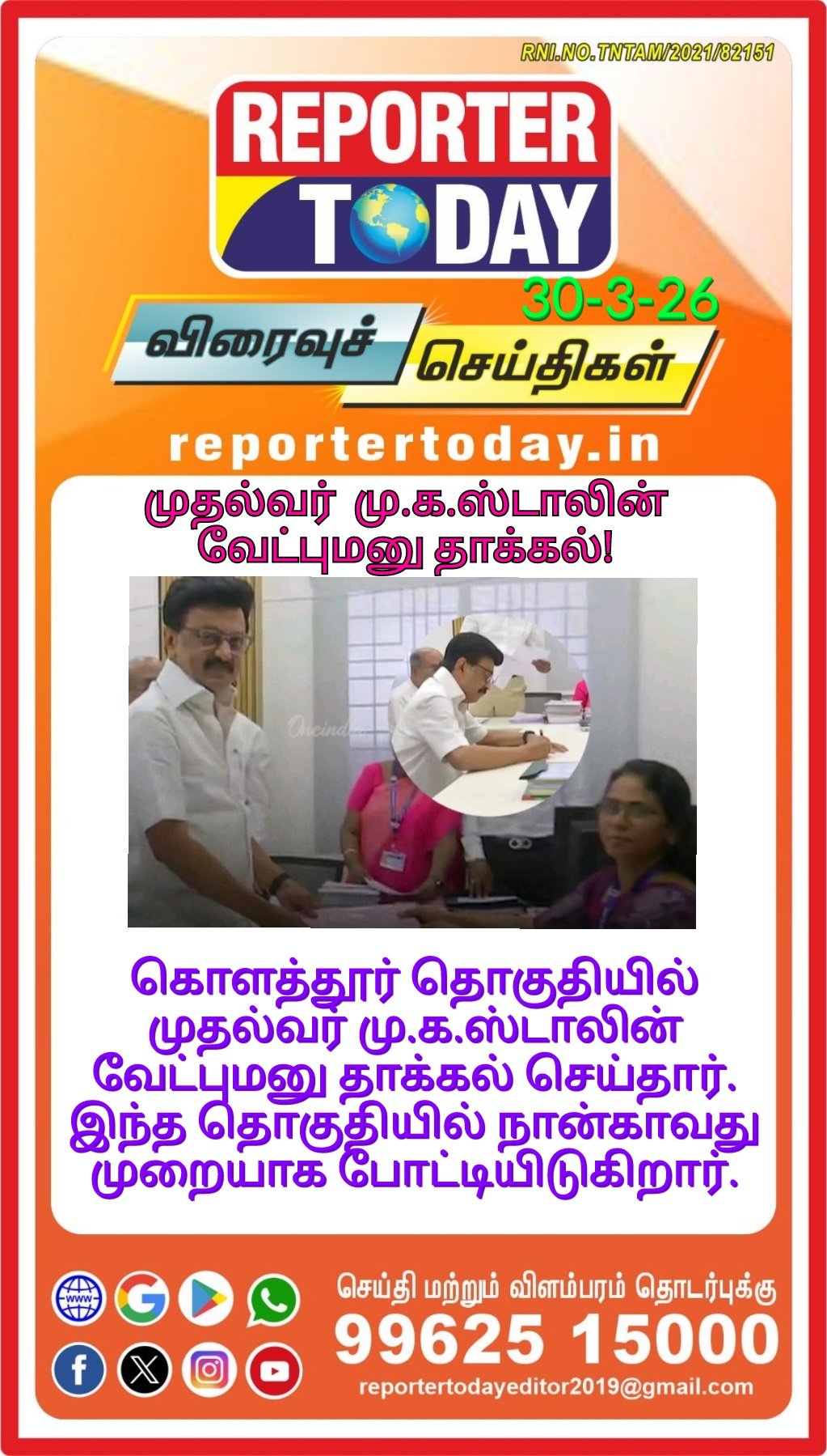 கொளத்தூர் தொகுதியில் முதல்வர் மு.க.ஸ்டாலின் வேட்புமனு தாக்கல் செய்தார். இந்த தொகுதியில் நான்காவது முறையாக போட்டியிடுகிறார்