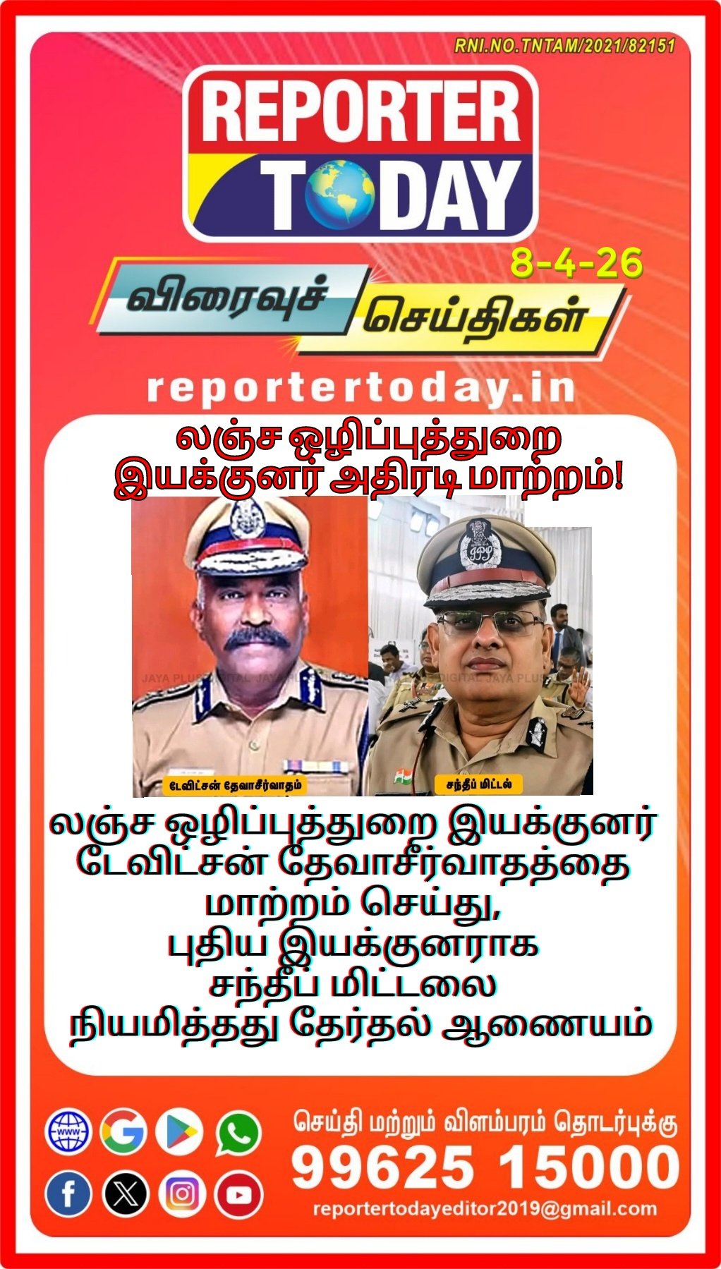 லஞ்ச ஒழிப்புத்துறை இயக்குனர் டேவிட்சன் தேவாசீர்வாதத்தை மாற்றம் செய்து, புதிய இயக்குனராக சந்தீப் மிட்டலை நியமித்தது தேர்தல் ஆணையம்!